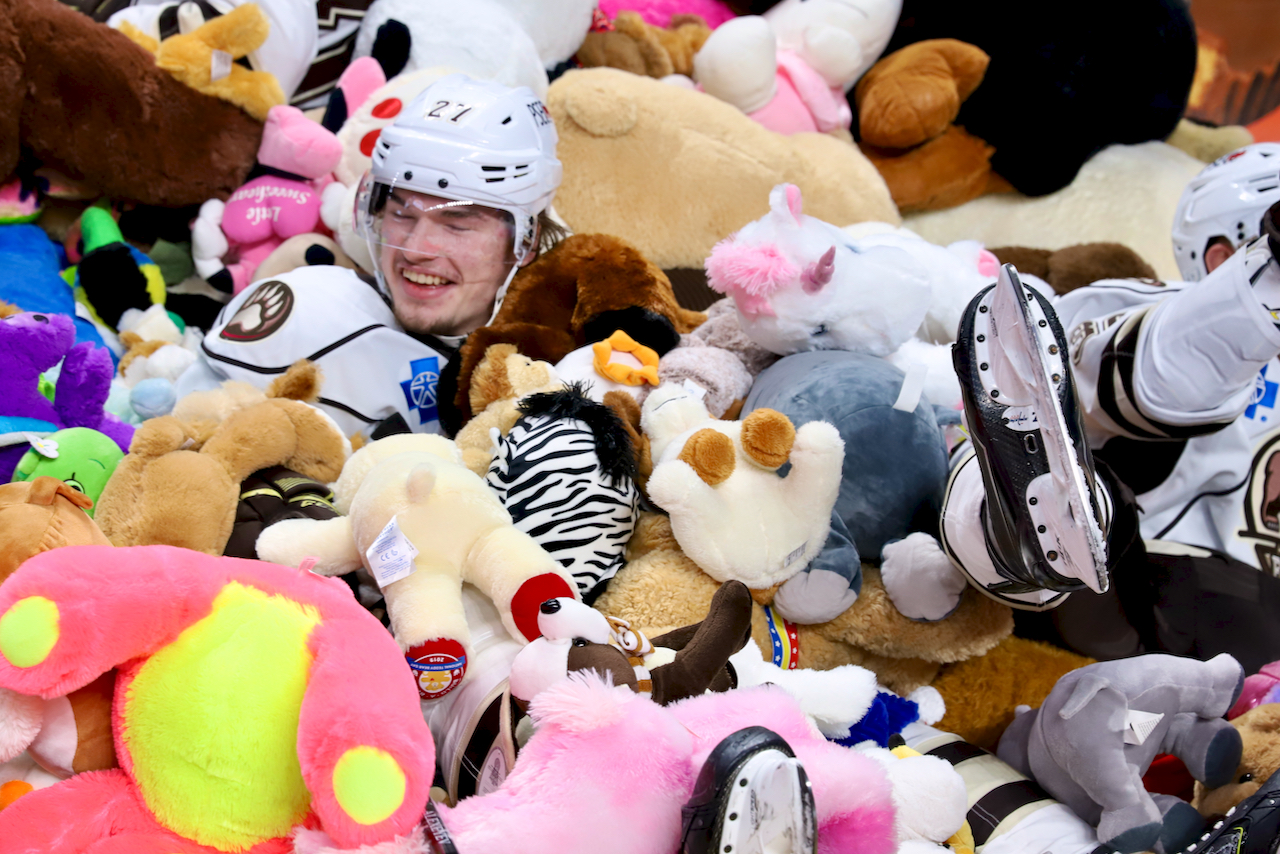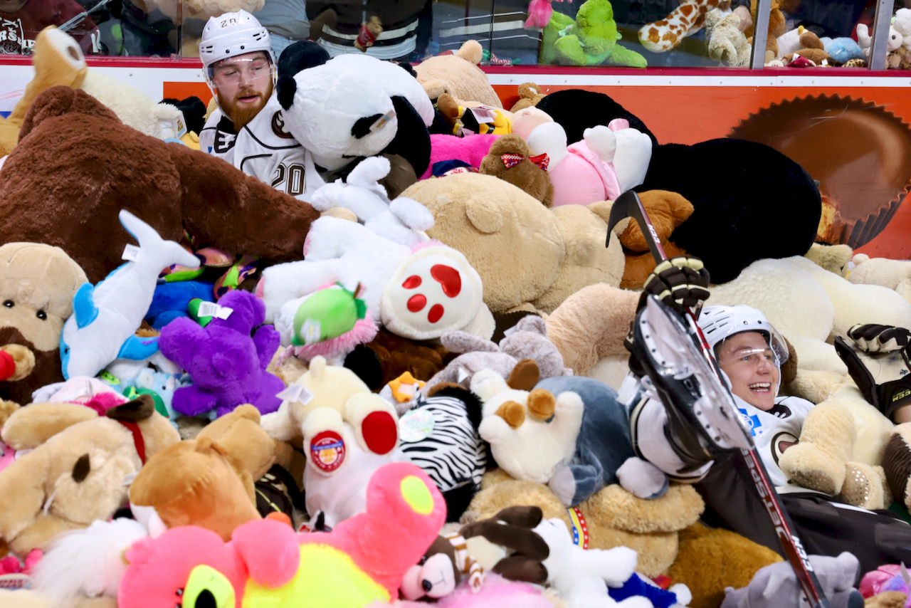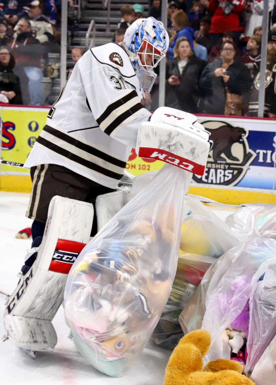 I finally went up to Hershey to attend a Bears game on Sunday. It was Teddy Bear Toss night, where Hershey broke their own world record for the most stuffed toys thrown onto the ice – 45,650.